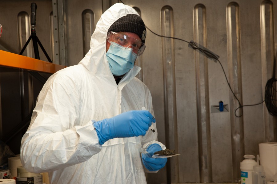 Brendan Reilly and Tina van de Flierdt carried out the microbiology sampling, working their way through 1cm slices of the core, taking multiple samples from each. This painstaking process also requires careful protocols to avoid contamination from other sources of DNA, so they were suited up in masks, googles, and protective suits.