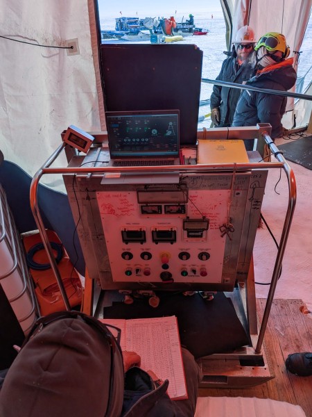 The team have begun to melt a hole through the ice to make our well. They’re using water from snow melted in the flubbers, warmed through six heaters to reach around 75°C, passed through the hose and out the hot water drill nozzle, which is slowly lowered through the ice to melt the hole.