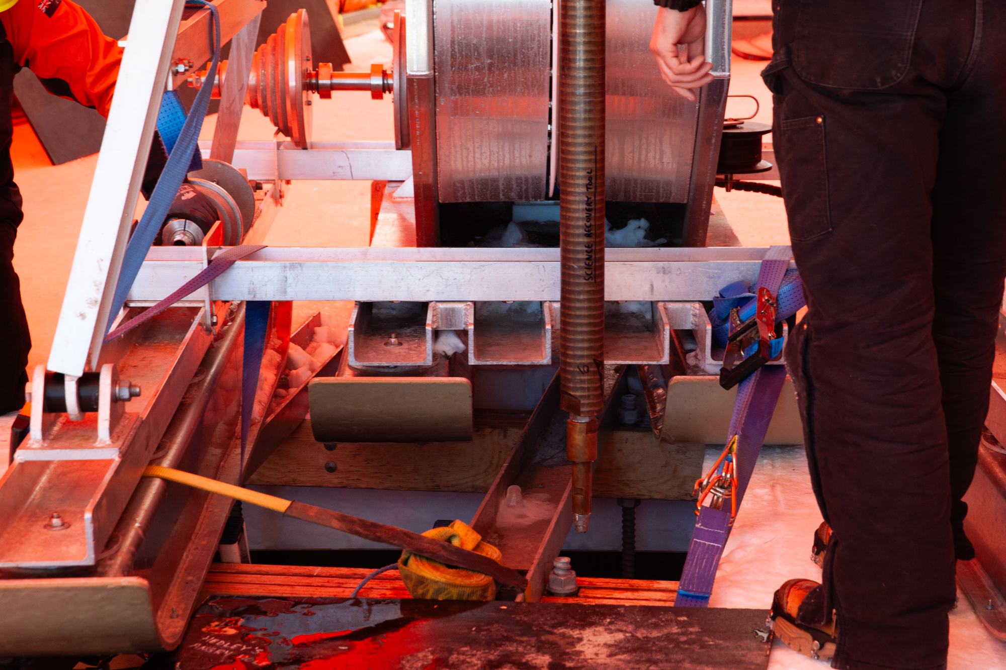Today the team began boring the well hole through the Ross Ice Shelf. They’re using water from snow melted in the flubbers, circulated through our six boilers to reach a temperature of 75°C, passed down a hose and through a hot water drill nozzle, which is slowly lowered to melt a hole through the ice.
