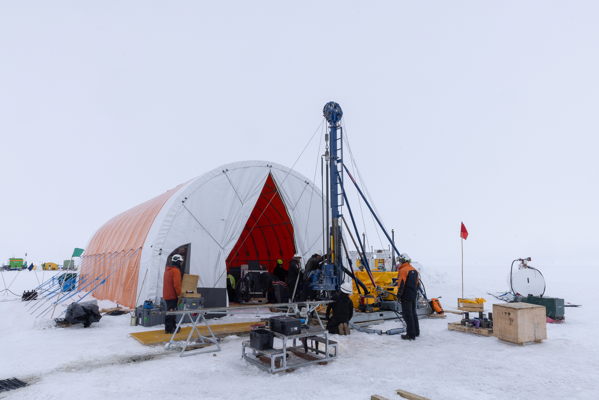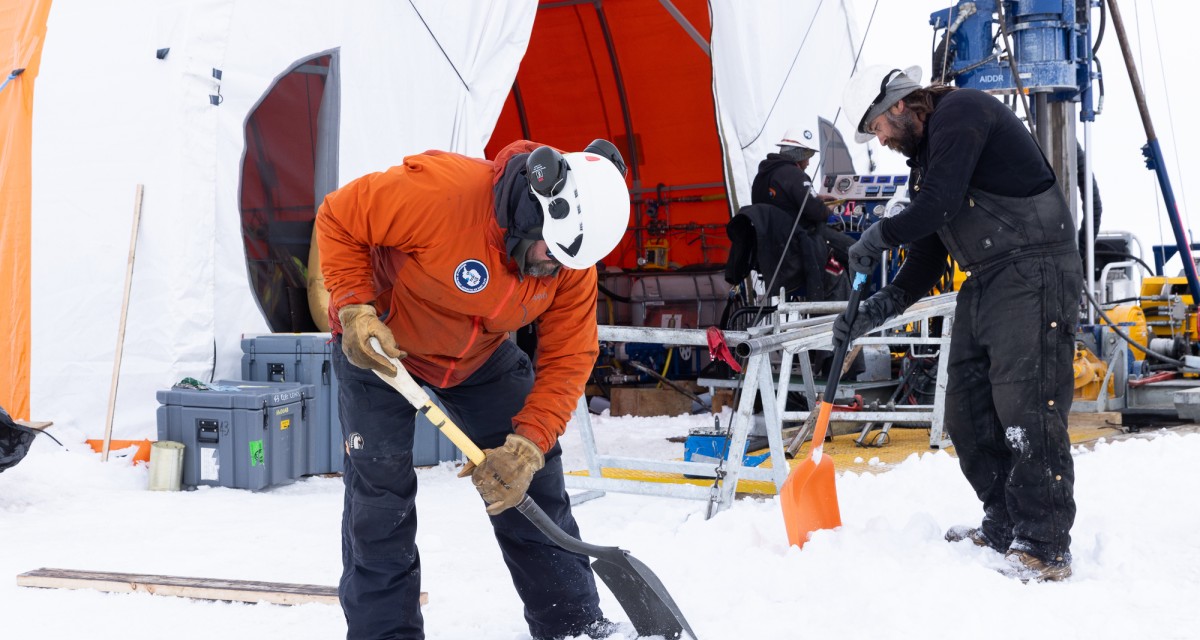 The rig sits on flitch beams, and with melting occuring during some warm days, and the weight of the drill string, it had sunk a little into the firn (the snow layer at the top of the ice sheet). The team lifted the rig and added blocks to make everything level and ready to go again. It was also an opportunity to freshen up the snow around the rig to remove any icy patches and fill any holes.