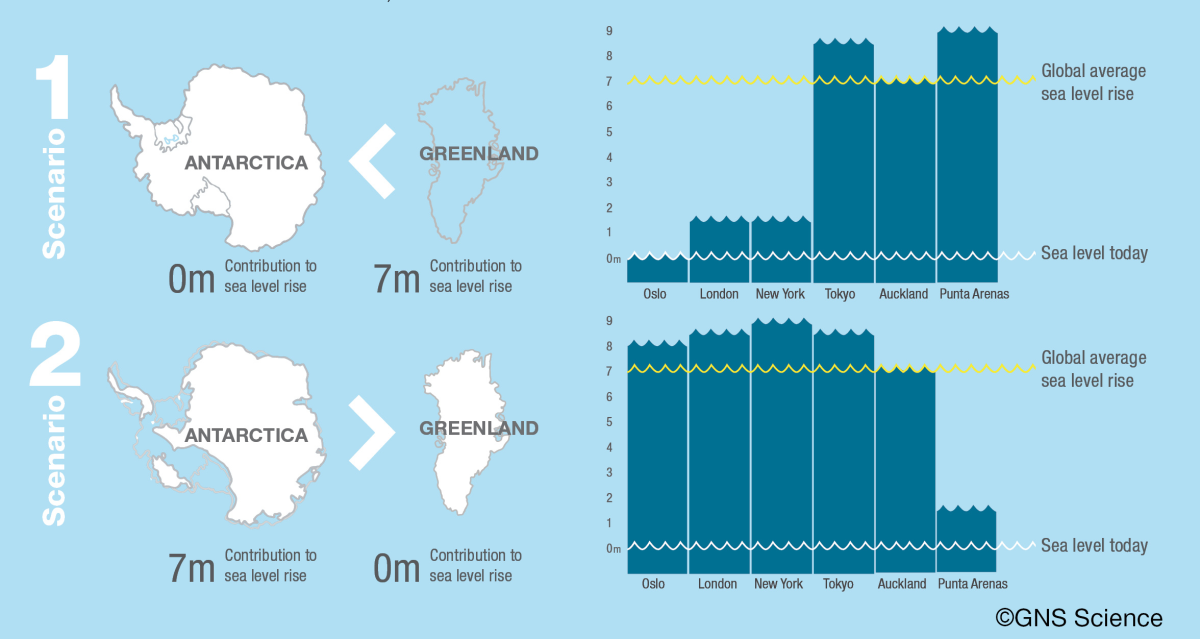 These complex processes mean that, in some parts of the world, sea level will rise more than the global average – and in other parts it may fall. For example, if Antarctica contributes to 7 meters of sea level rise, cities in the Southern Hemisphere, like Punta Arenas, Chile, and Wellington, New Zealand, sea level would rise by 1–2 m (3–6.5 feet). Whereas in the Northern Hemisphere, cities like London and New York would experience an increase in sea level of up to 9 metres (29 feet).